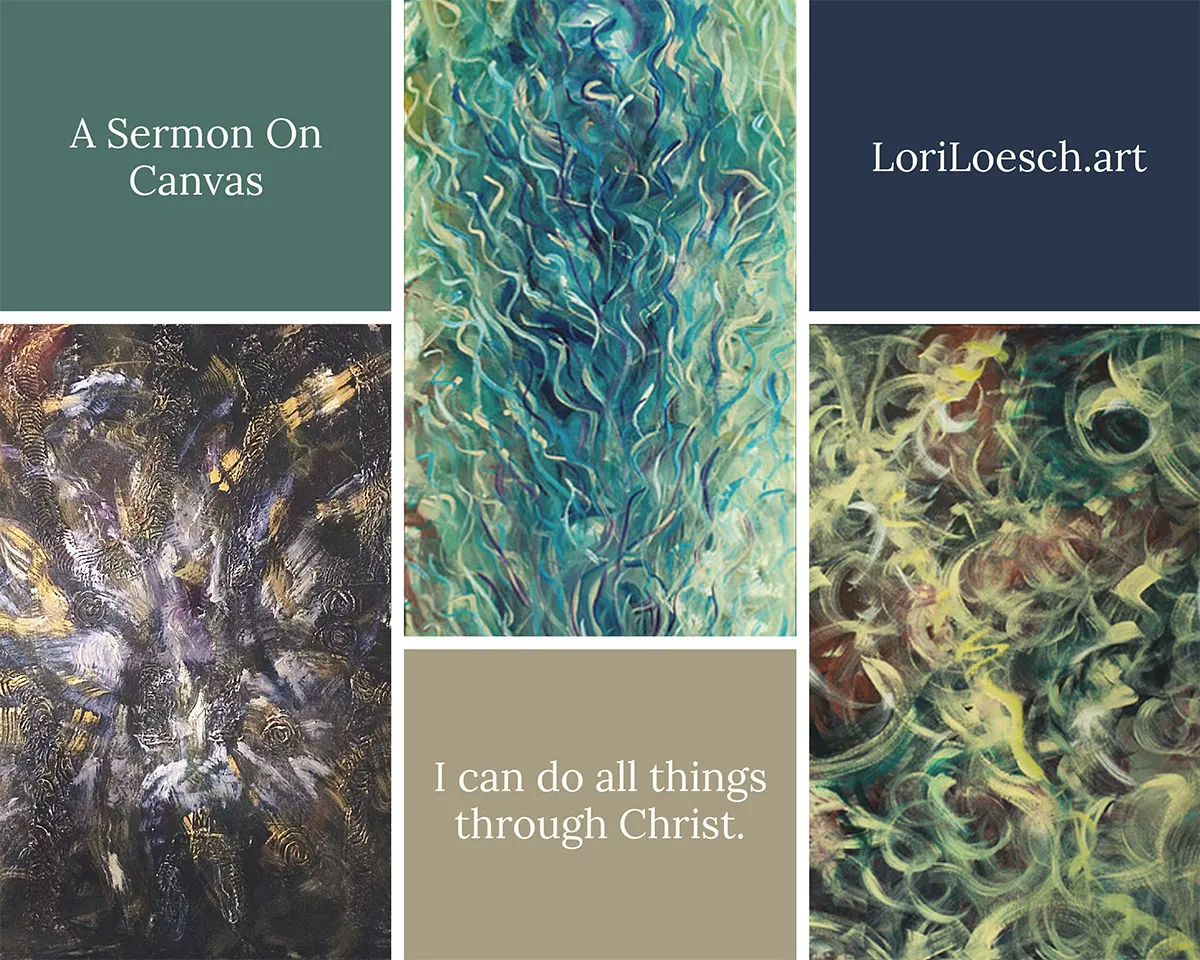 My art is God inspired abstract, a sermon on canvas. As His vessel, I create a unique message full of energy through the process of intuitive creation. Some sermons on canvas stimulate memories or touch emotions, but others reach beyond the visual and touch the depth of the soul. Each piece is inspired by scripture and resonates a positive expression of divine vision and understanding.